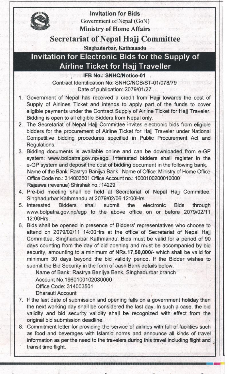 हज यात्रीहरुको हवाइ टिकट खरिद सम्बन्धी बोलपत्र आव्हानको सूचना