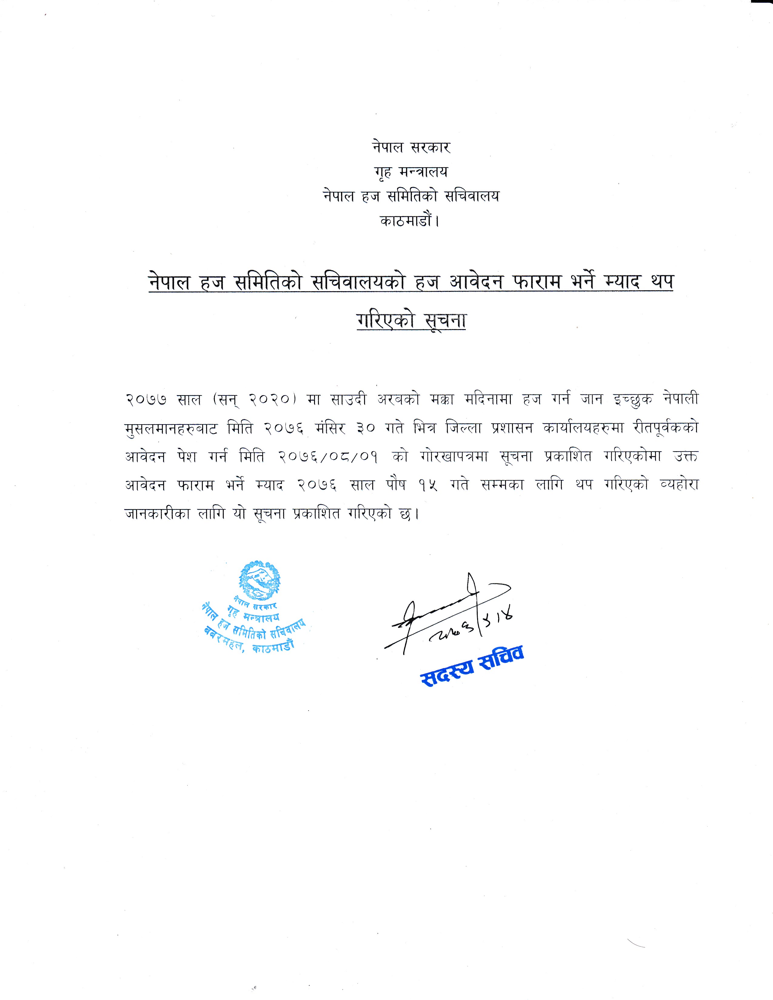 नेपाल हज समितिको हज आवेदन फाराम भर्ने म्याद थप गरिएको सूचना
