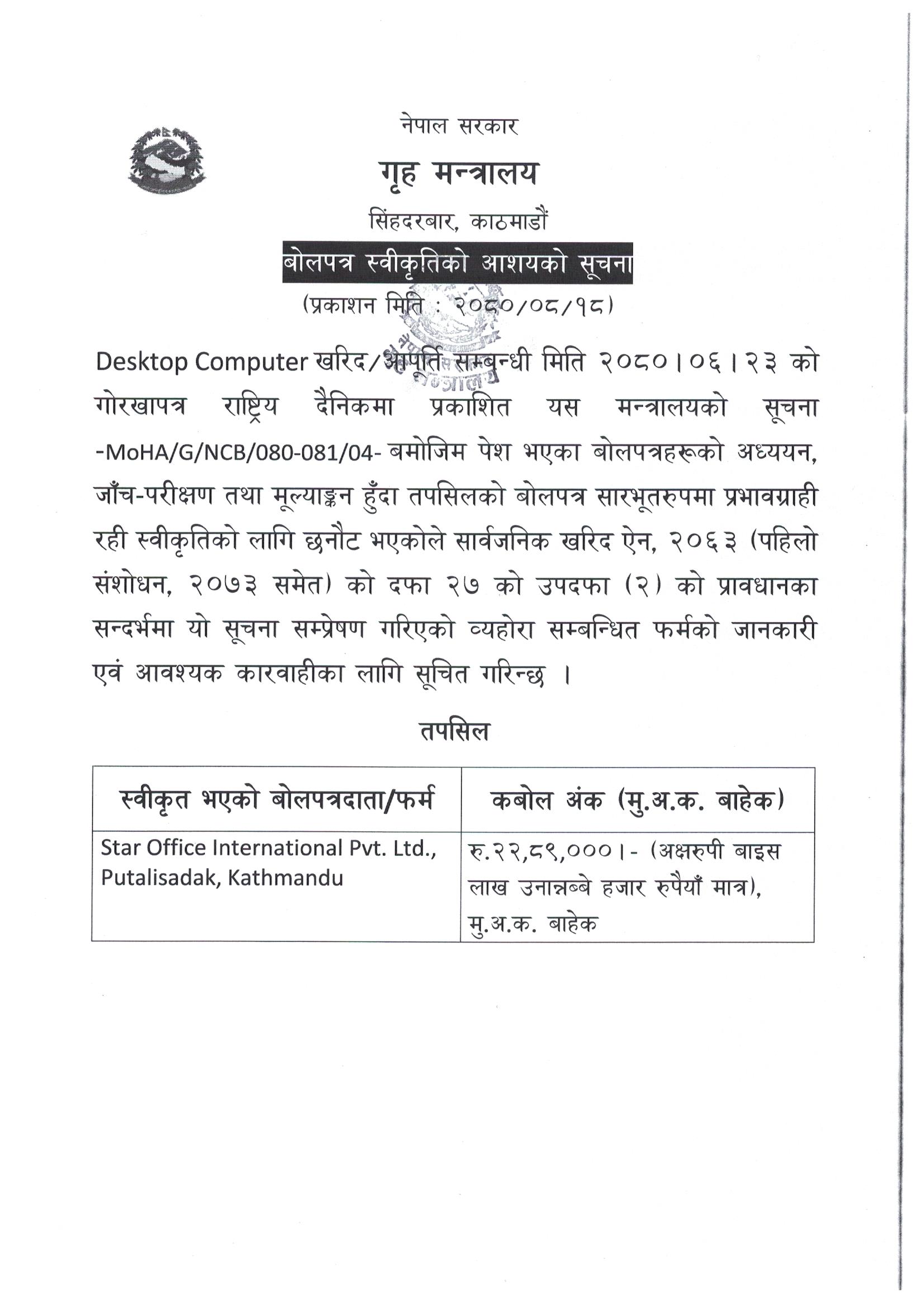शिलबन्दी दरभाउपत्र स्वीकृत गर्ने आशयको सूचना (प्रकाशन मिति: २०८३/०१/०४)