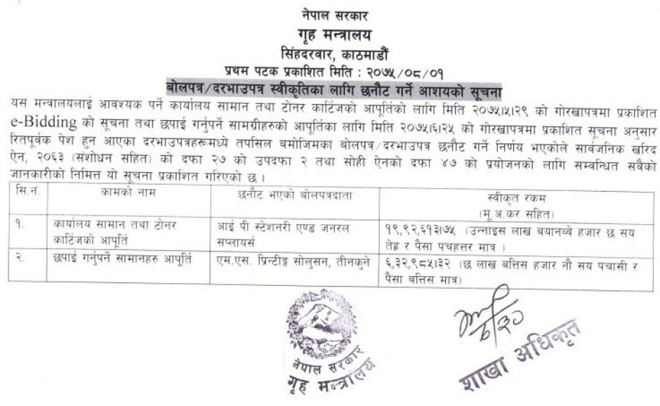 | बोलपत्र स्वीकृतीका लागि छनौट गर्ने आशयको सूचना |