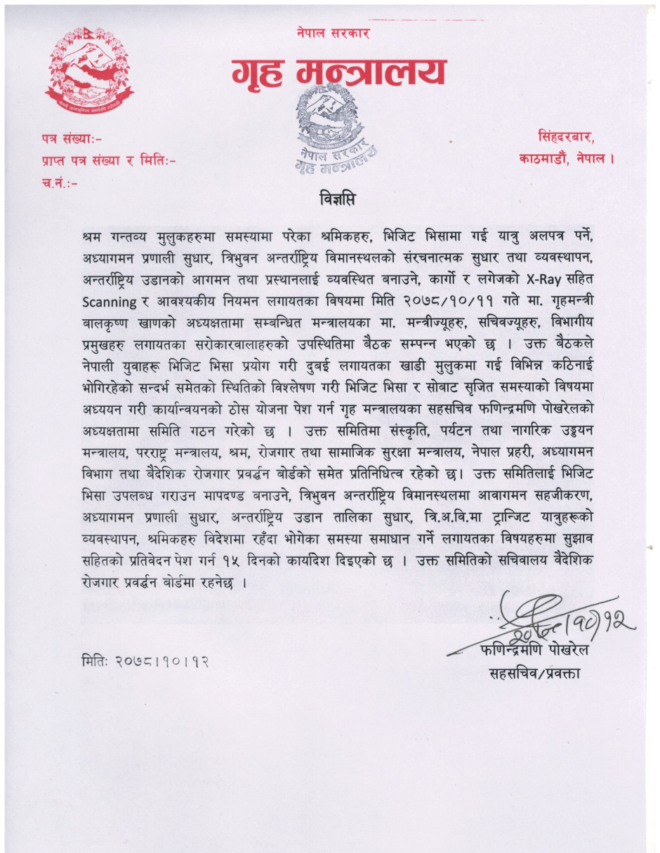 भिजिट भिसा र सोबाट सिर्जित समस्याको अध्ययन गरी कार्यान्वयनको ठोस योजना पेश गर्न गठित समिति सम्बन्धमा