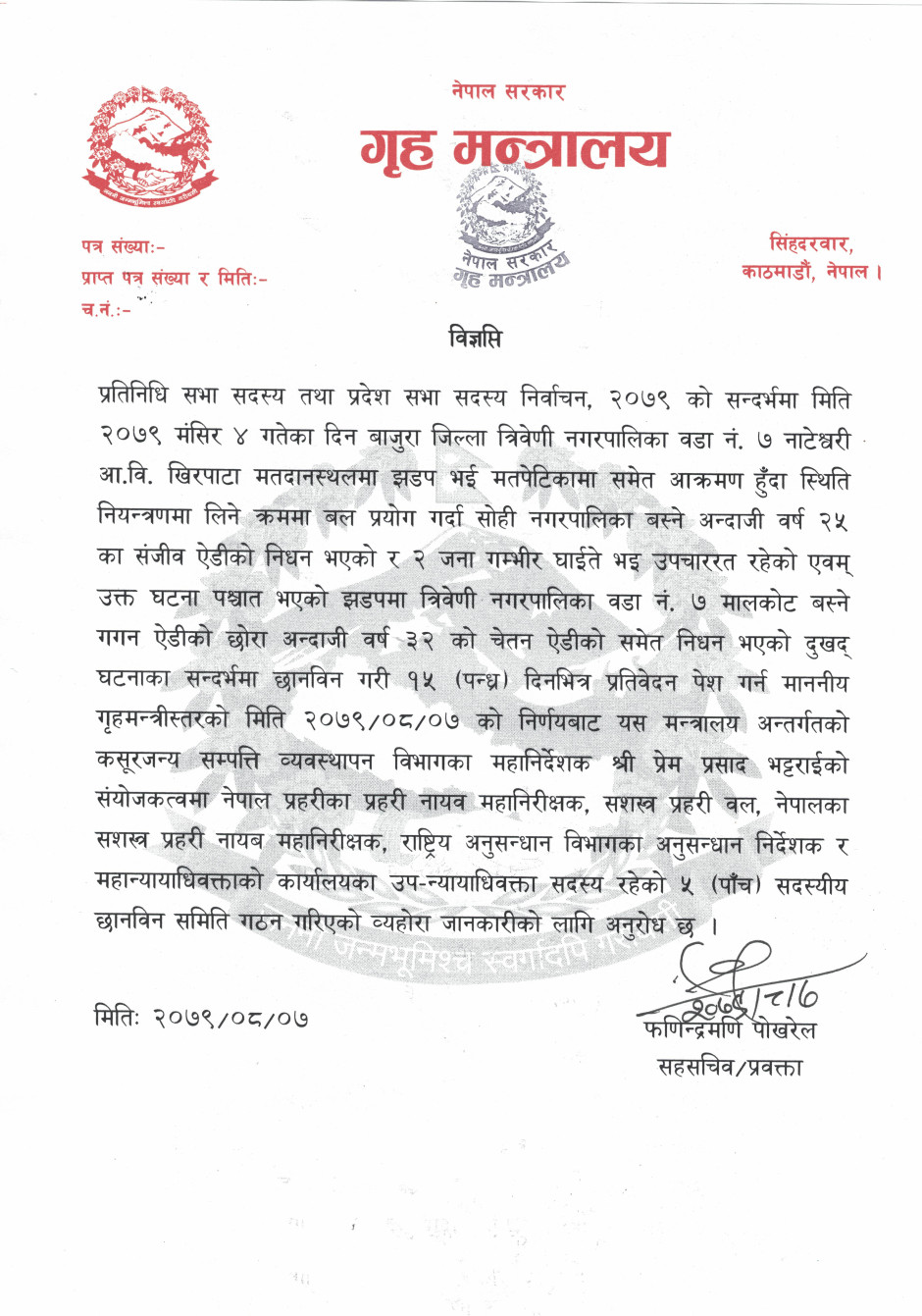छानविन समिति गठन गरिएको सम्बन्धमा प्रेस विज्ञप्ति