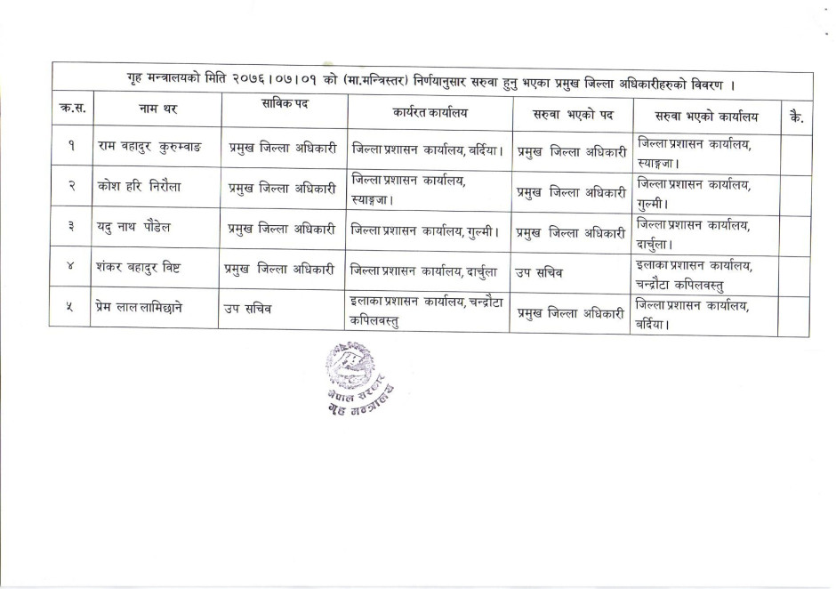 गृह मन्त्रालयको मिति २०७६।०७।०१ को निर्णयानुसार सरुवा हुन भएका प्रमुख जिल्ला अधिकारीहरुको विवरण