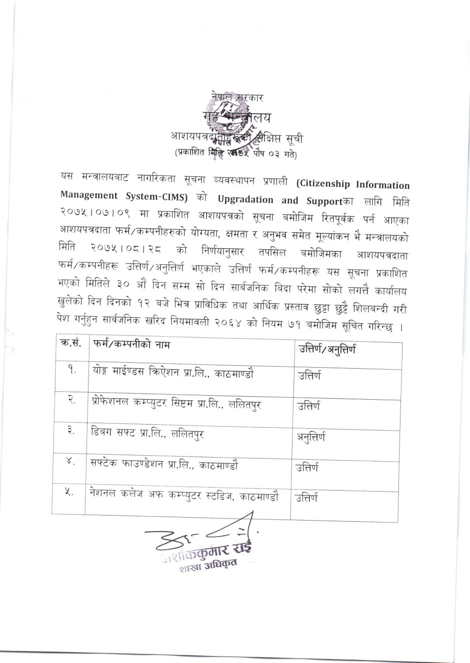 CIMS Upgradation and Support को आशयपत्रदाताहरूको संक्षिप्त सूची
