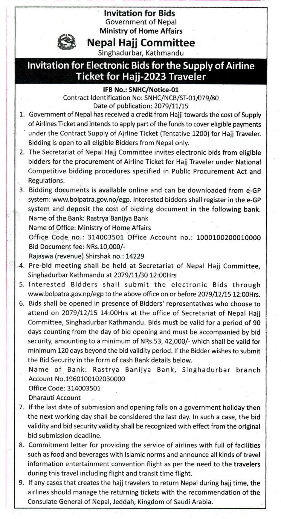 हवाइ टिकटको बोलपत्र आह्वान सम्बन्धी सूचना