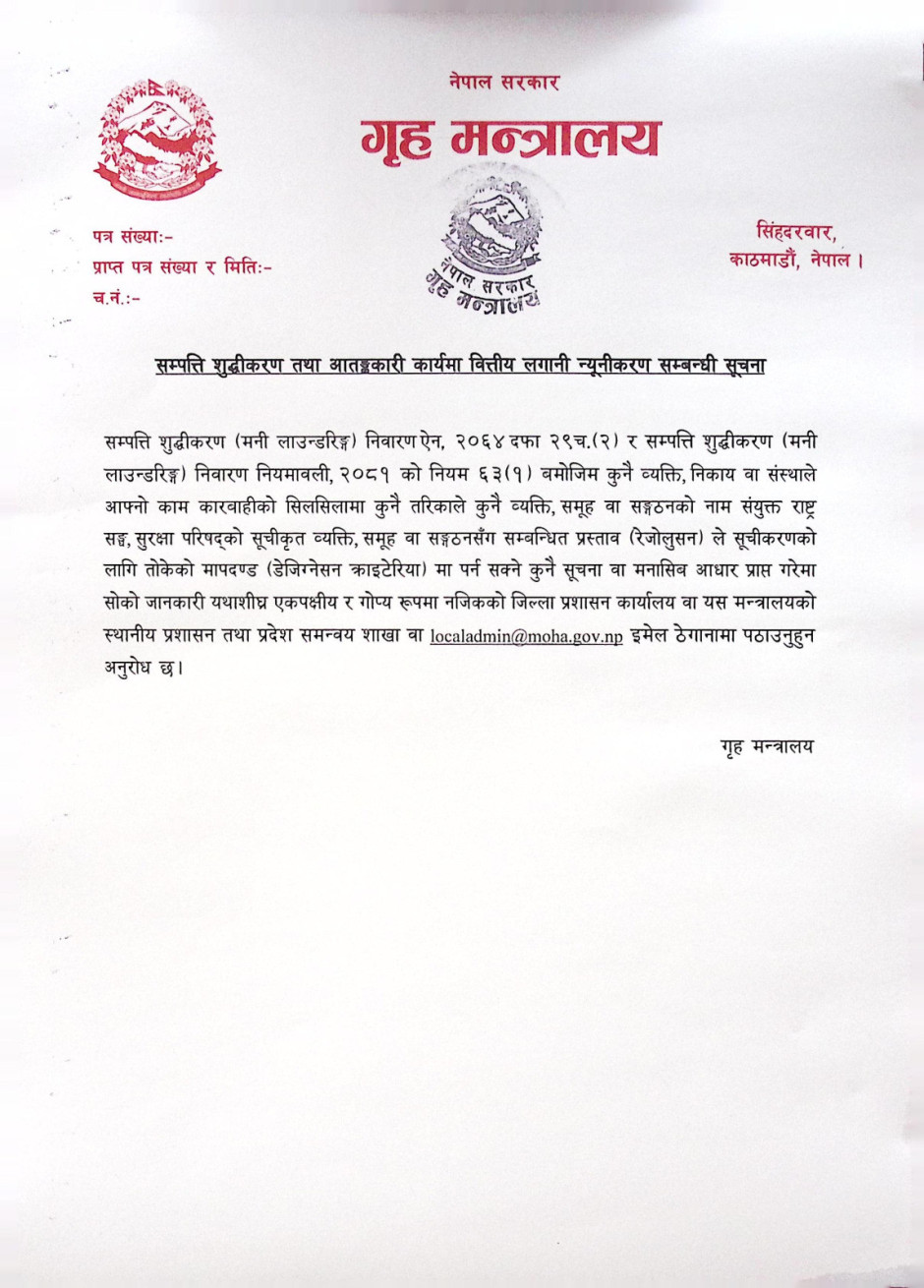 सम्पत्ति शुद्धीकरण तथा आतङ्ककारी कार्यमा वित्तीय लगानी न्यूनीकरण सम्बन्धी सूचना