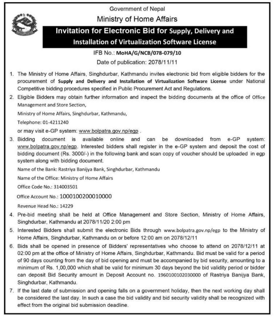 Virtualization license खरिद सम्बन्धी बोलपत्र आव्हानको सूचना