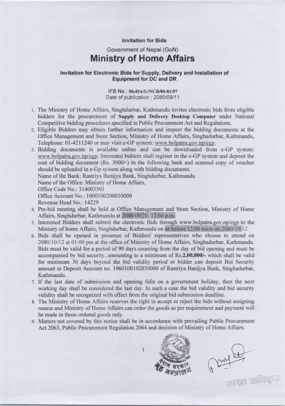 supply,Delivery and Installation of Equipment for DC and DR सम्बन्धी बोलपत्र आव्हानको सूचना