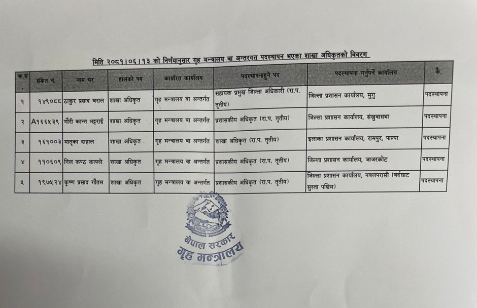 मिति २०८१।०६।१३ को निर्णयानुसार गृह मन्त्रालय वा अन्तरगत पदस्थापना भएका शाखा अधिकृतको विवरण