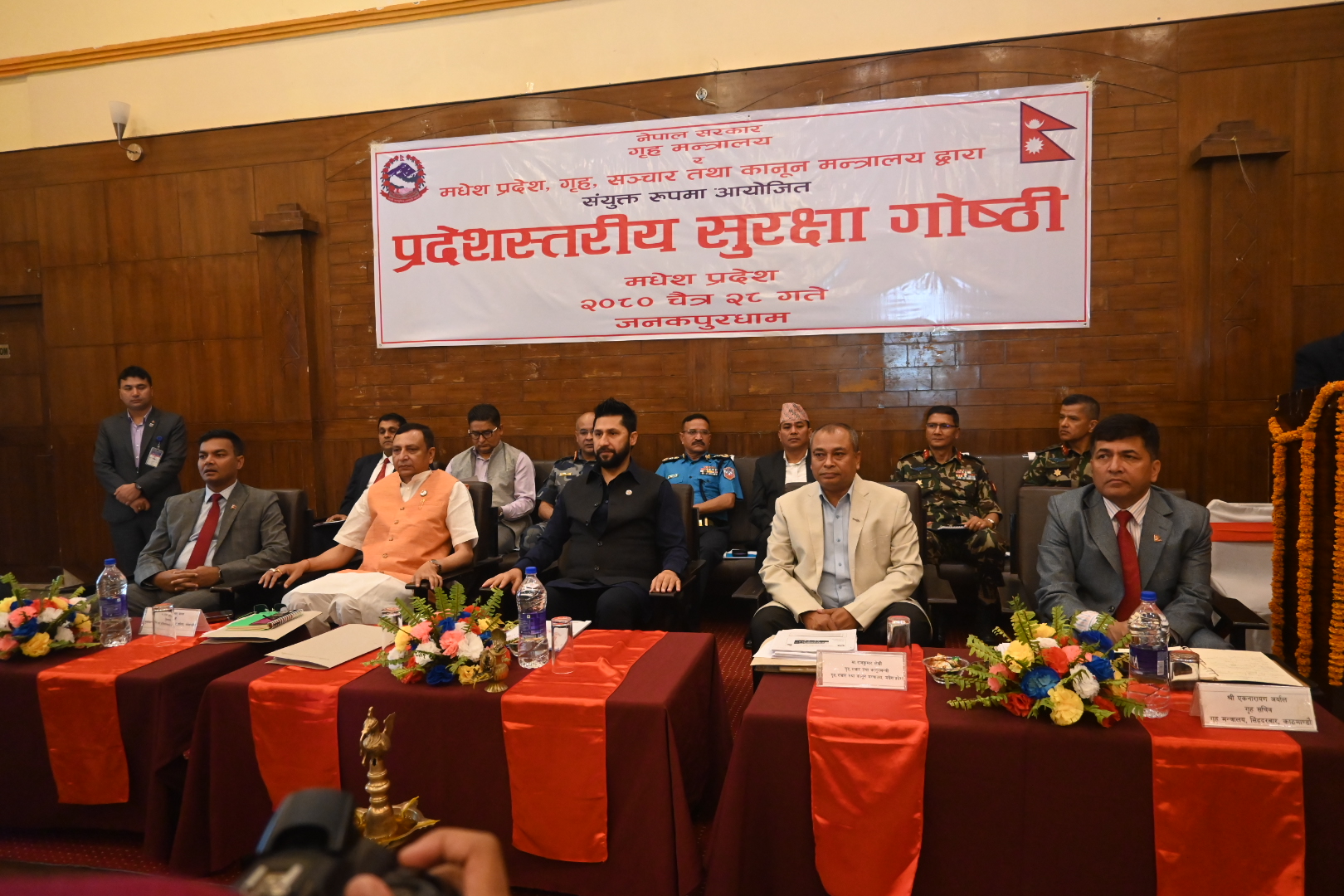 मा. उपप्रधानमन्त्री एवम् गृहमन्त्री रवि लामिछानेज्यूको प्रमुख आतिथ्यमा धनुषाको जनकपुरधाममा चैत्र २८, बुधबारका दिन आयोजित प्रदेशस्तरीय सुरक्षा गोष्ठी सम्पन्न भएको छ। नेपाल सरकार गृह मन्त्रालय र मधेश प्रदेश, गृह, सञ्चार तथा कानुन मन्त्रालयद्वारा संयुक्त रूपमा आयोजना गरिएको एक दिवसीय प्रदेशस्तरीय सुरक्षा गोष्ठीको अध्यक्षता गृह सचिव एकनारायण अर्यालज्यूले गर्नुभएको थियो। गोष्ठीमा मधेस प्रदेश, गृह, सञ्चार तथा कानुन मन्त्रालयका सचिव वीरेन्द्र कुमार यादवज्यूलर स्वागत मन्तव्य व्यक्त गर्दै गोष्ठीको उद्देश्यमाथि प्रकाश पार्नुभएको थियो ।