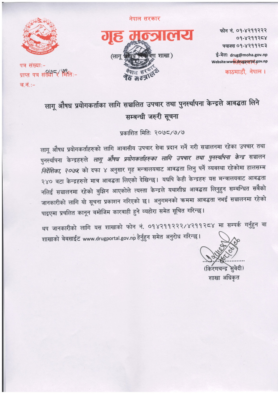 लागू औषध प्रयोगकर्ताका लागि सञ्चालित उपचार तथा पुनर्स्थापना केन्द्र आबद्धता लिने सम्बन्धी जरुरी सूचना