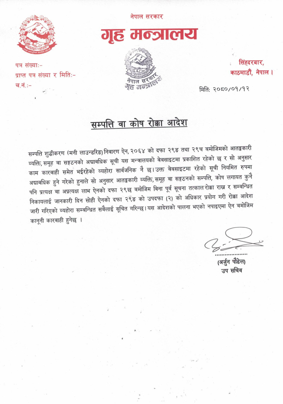 सम्पत्ति वा कोष रोक्का आदेश (अगष्ट २०२५)