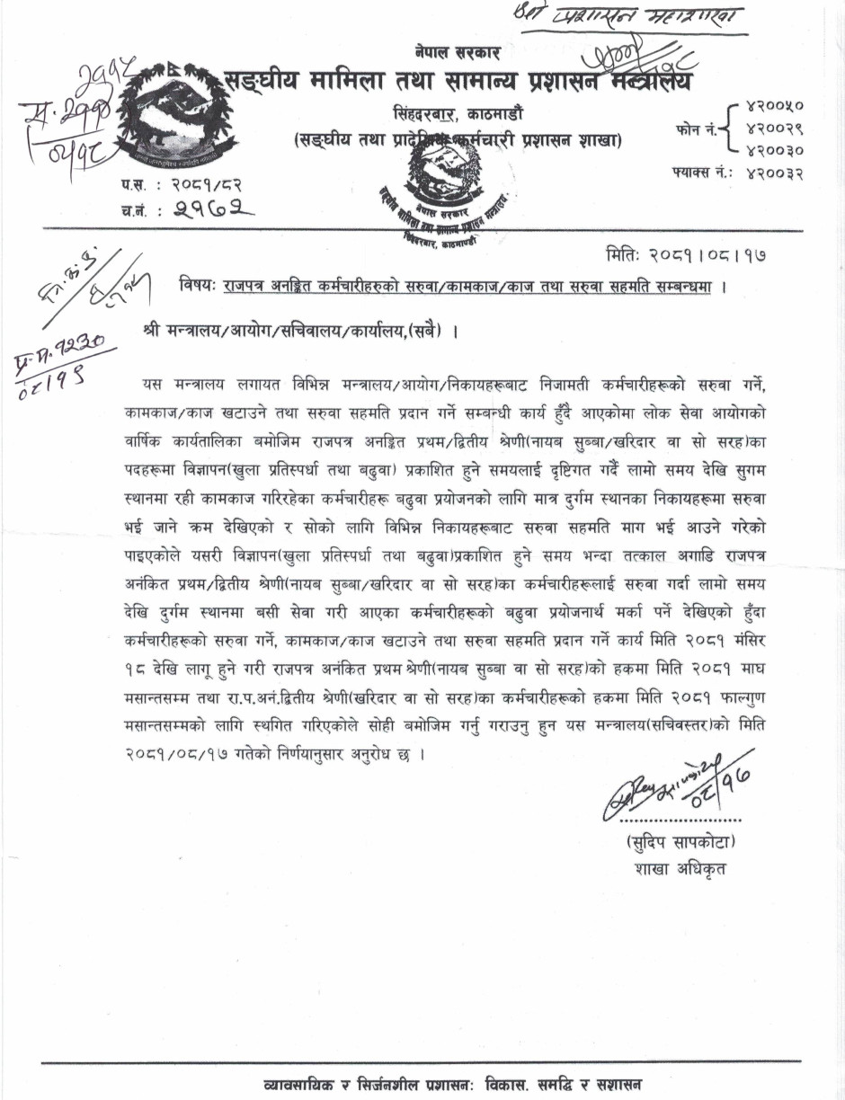 सङ्घीय मामिला तथा सामान्य प्रशासन मन्त्रालयको राजपत्र अनङ्कित कर्मचारीहरुको सरुवा/कामकाज/काज तथा सरुवा सहमति सम्बन्धमा- सबै कार्यालय।