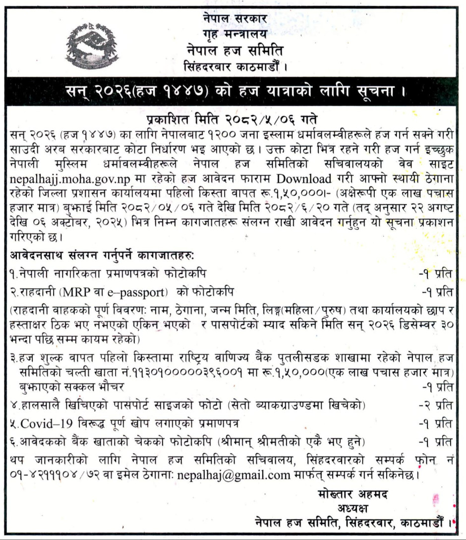 सन् २०२६ (हज १४४७) को हज यात्राको लागि सूचना