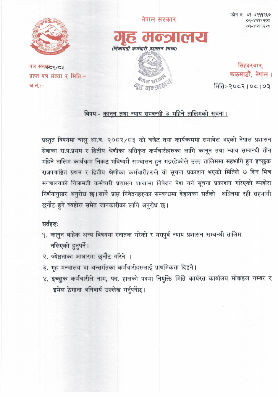 कानून तथा न्याय सम्बन्धी ३ महिने तालिमको सूचना ।