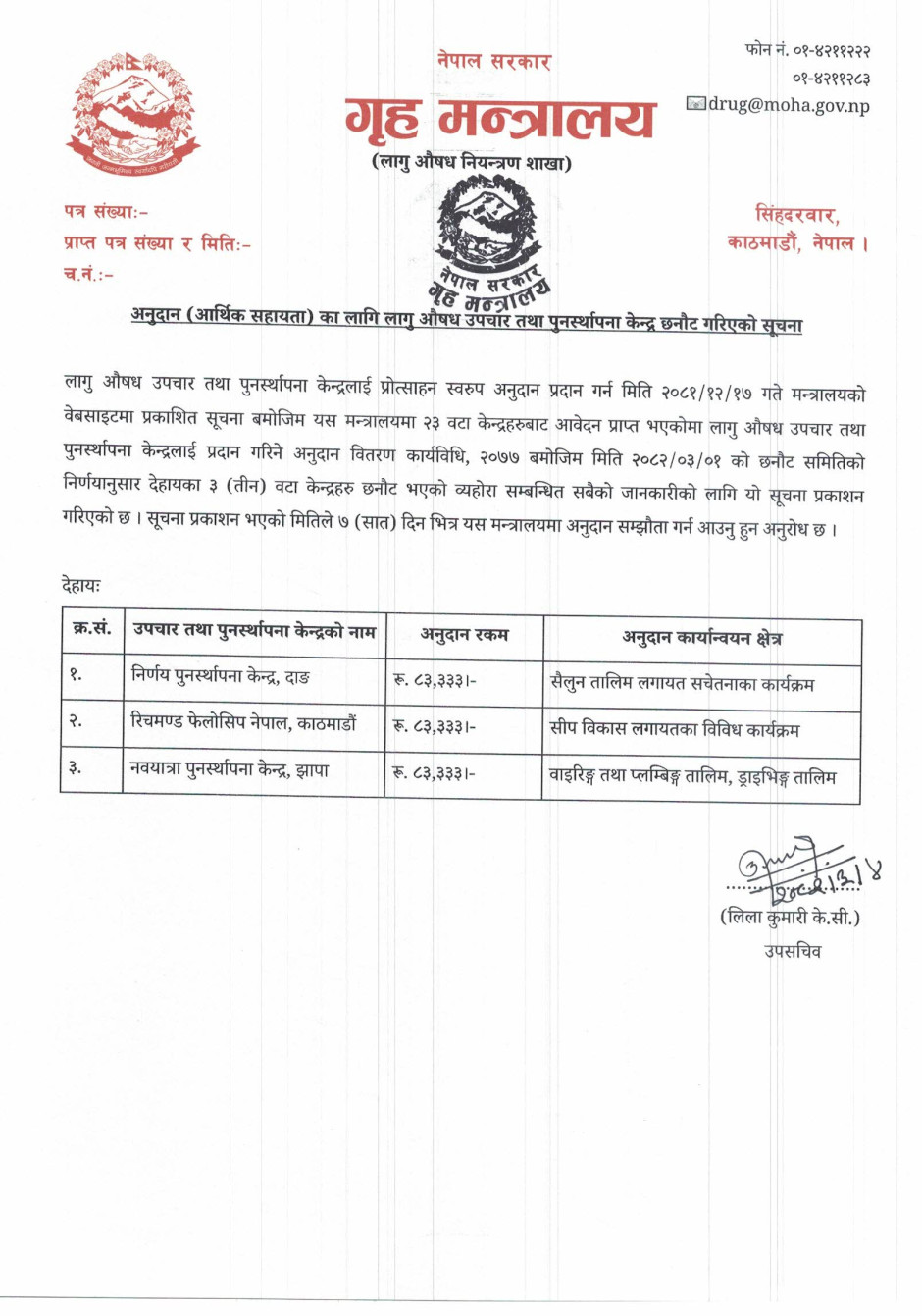 अनुदान (आर्थिक सहायता) का लागि लागु ओषध उपचार तथा पुनस्थापना केन्द्र छनौट गरिएको सूचना।