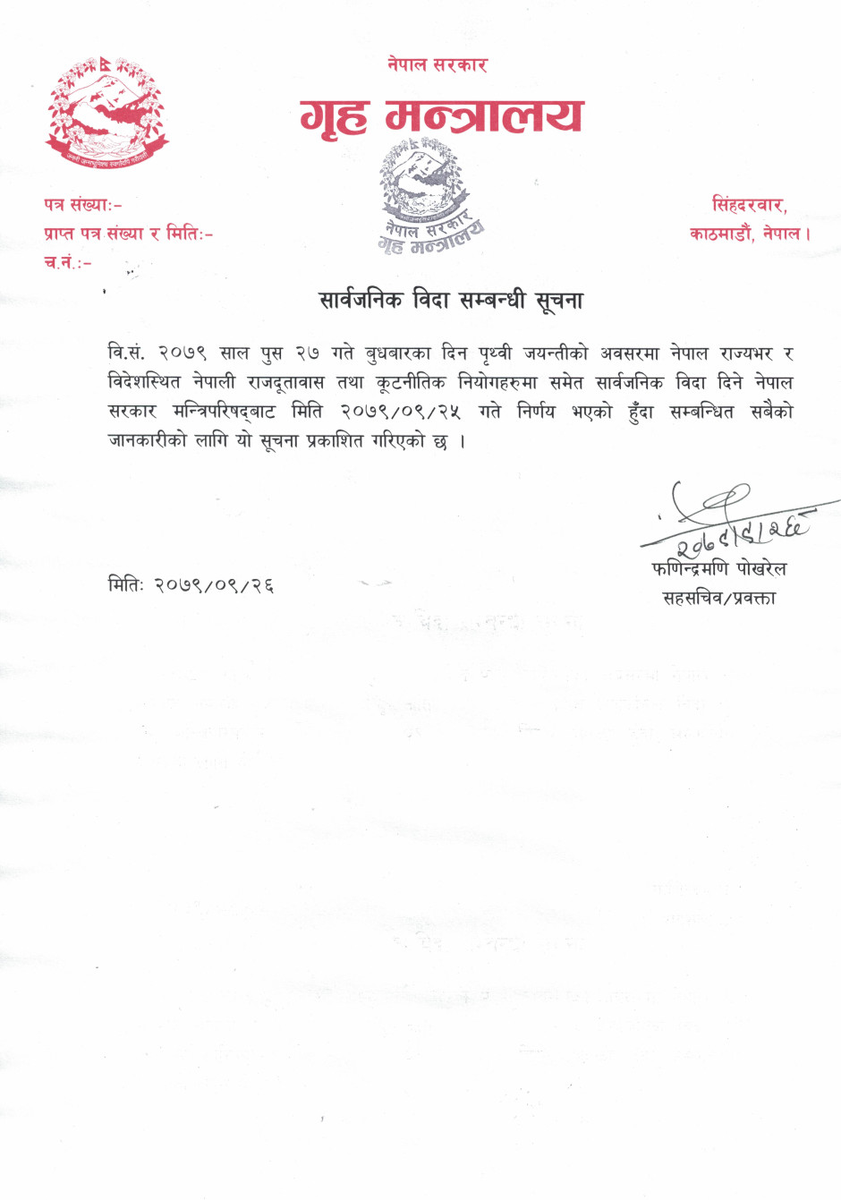 सार्वजनिक विदा सम्बन्धी सूचना