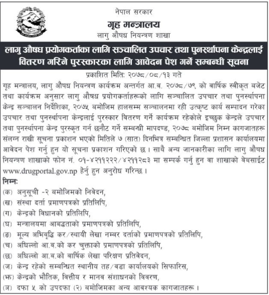 लागू औषध प्रयोगकर्ताका लागि सञ्चालित उपचार तथा पुनर्स्थापना केन्द्रलाई वितरण गरिने पुरस्कारका लागि आवेदन पेश गर्ने सम्बन्धी सूचना