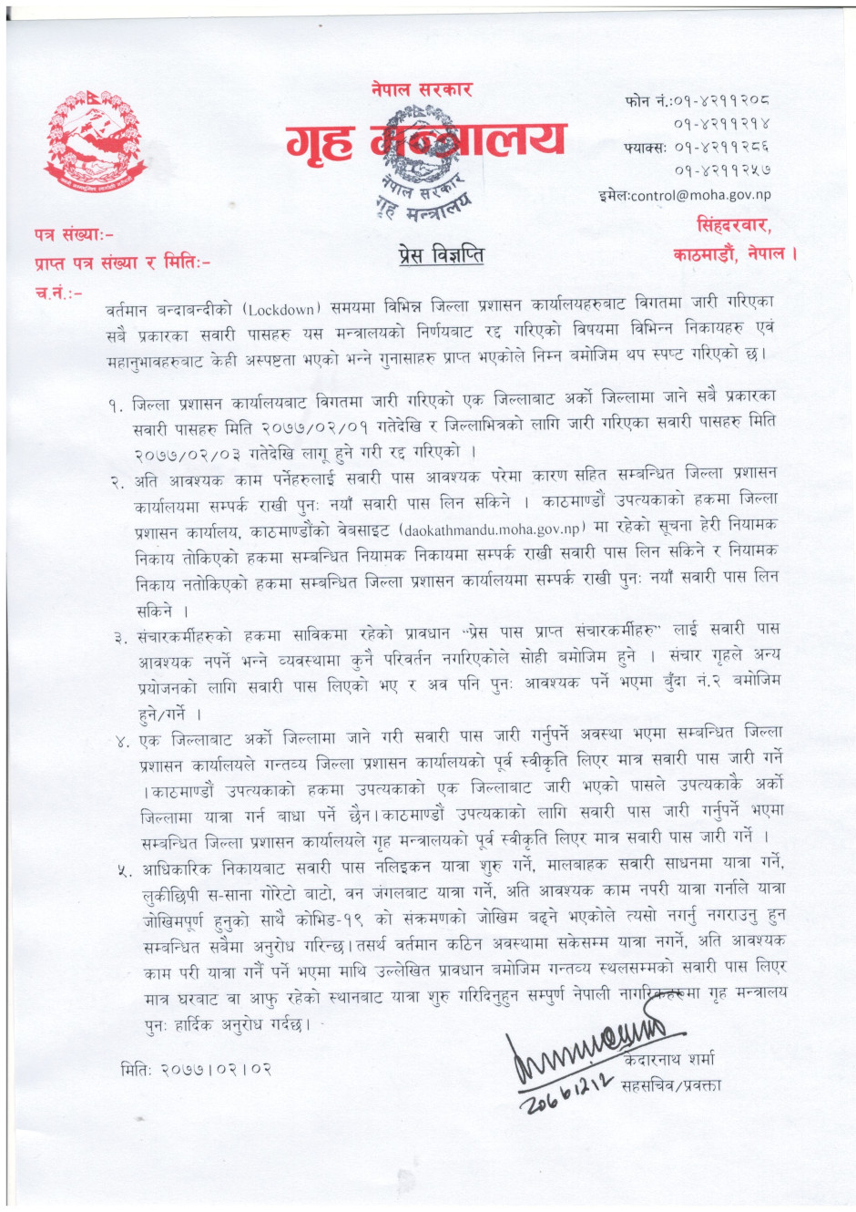 मिति २०७७/०२/०२ गते गृह मन्त्रालयद्वारा जारी प्रेस विज्ञप्ति