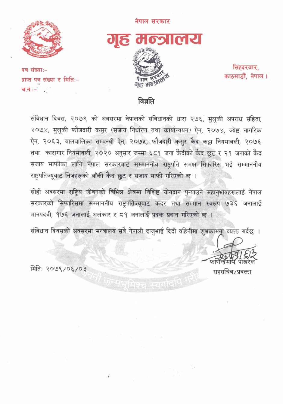 संविधान दिवसको अवसरमा विभूषण प्रदान तथा कैद छुट सम्बन्धी प्रेस विज्ञप्ति
