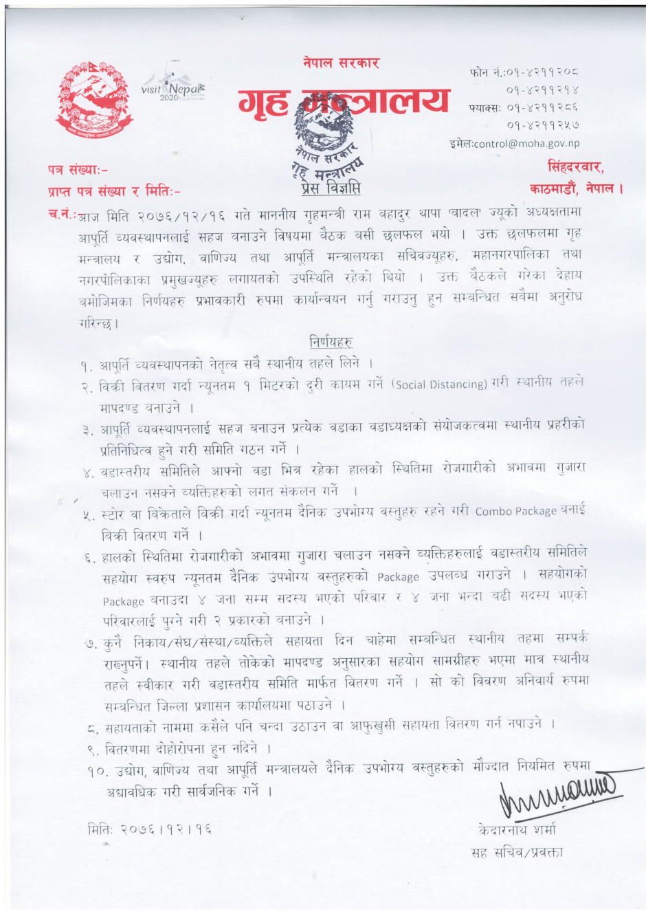 मिति २०७६/१२/१६ गते गृह मन्त्रालयद्वारा जारी प्रेस विज्ञप्ति