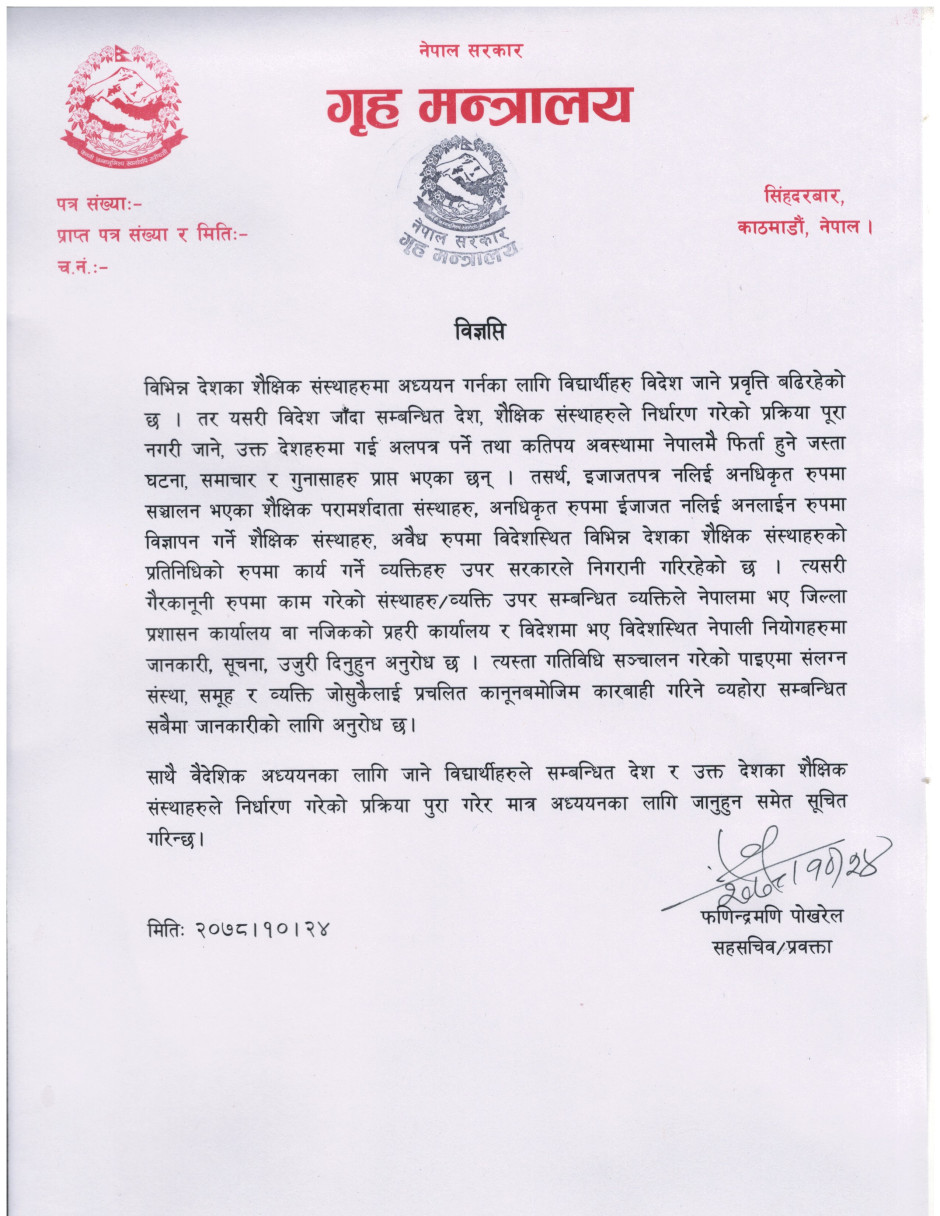 प्रेस विज्ञप्ति (विदेशस्थित शैक्षिक संस्थामा अध्ययन गर्न जाने विद्यार्थीहरुको गुनासो सम्बन्धमा)