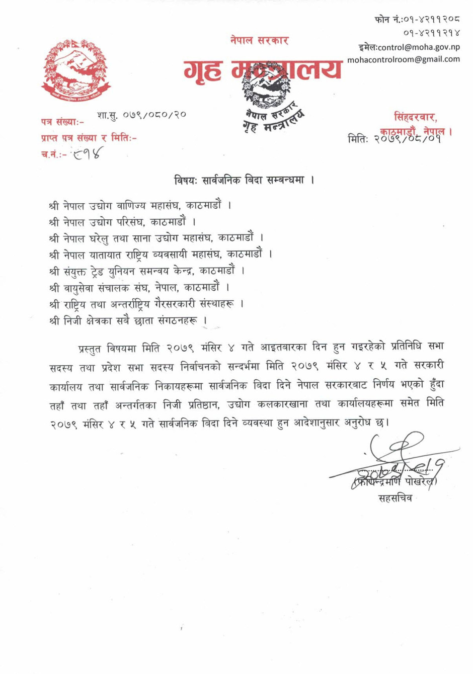 सार्वजनिक विदा सम्बन्धी पत्र