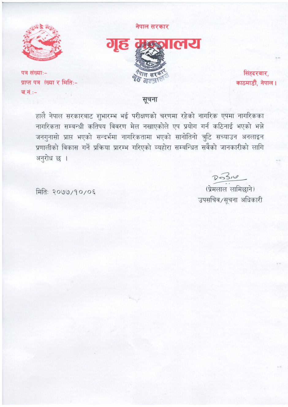 गृह मन्त्रालयसँग सम्बन्धित गुनासोका लागि सम्पर्क नम्बर