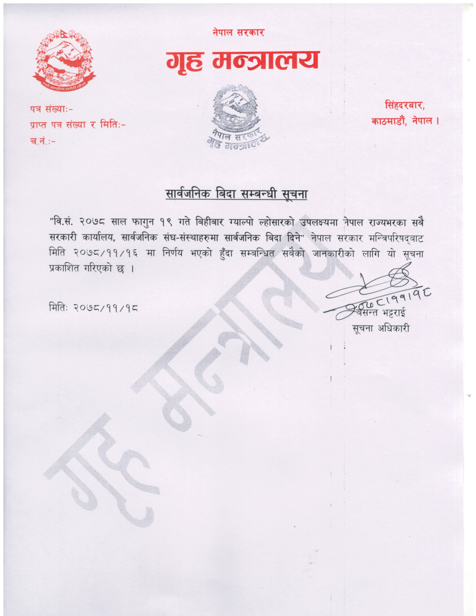 सार्वजनिक बिदा सम्बन्धी सूचना