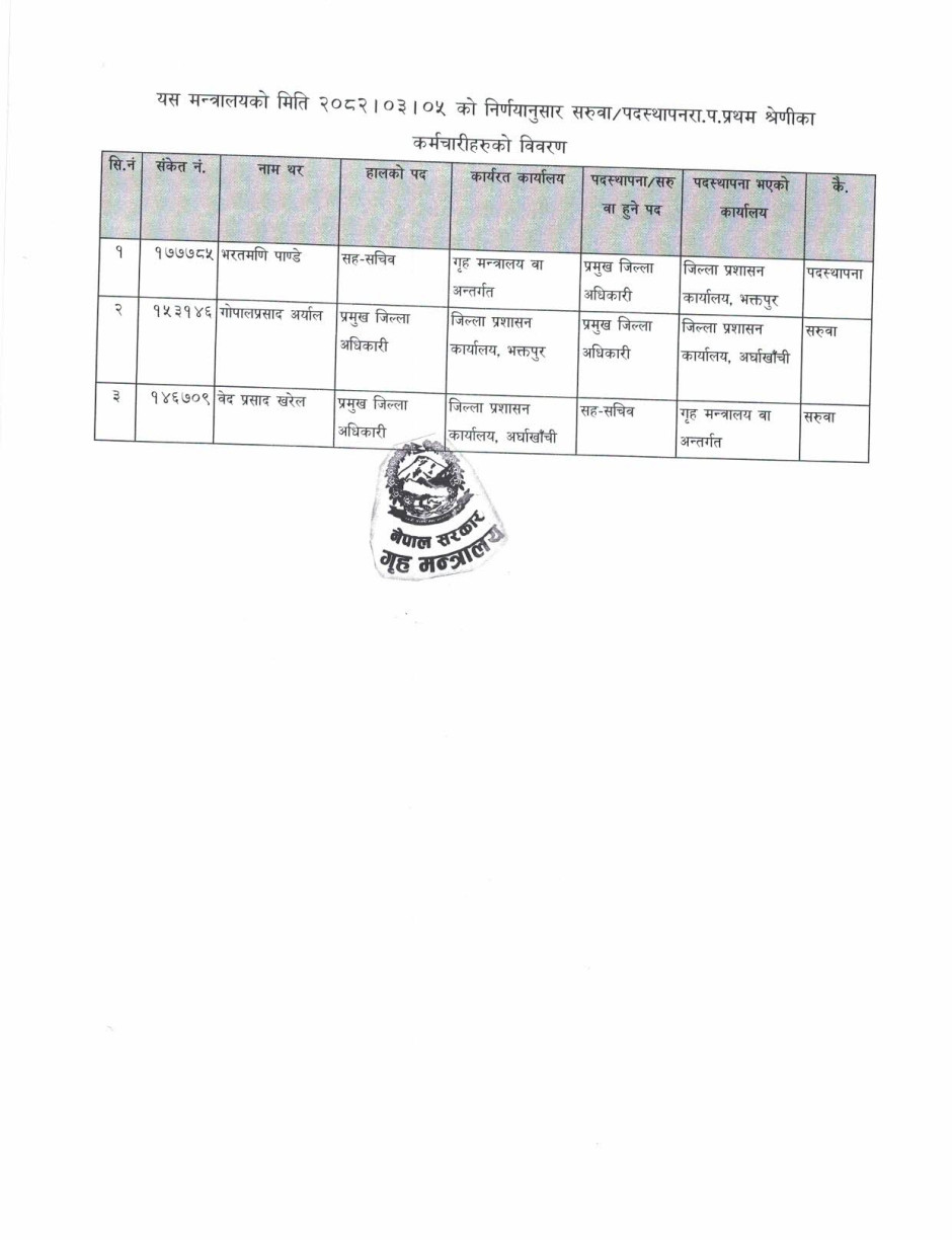 यस मन्त्रालयको मिति 2082।03।05 को निर्णयानुसार सरुवा/पदस्थापन भएका रा.प.प्रथम श्रेणीका कर्मचारीहरुको विवरण