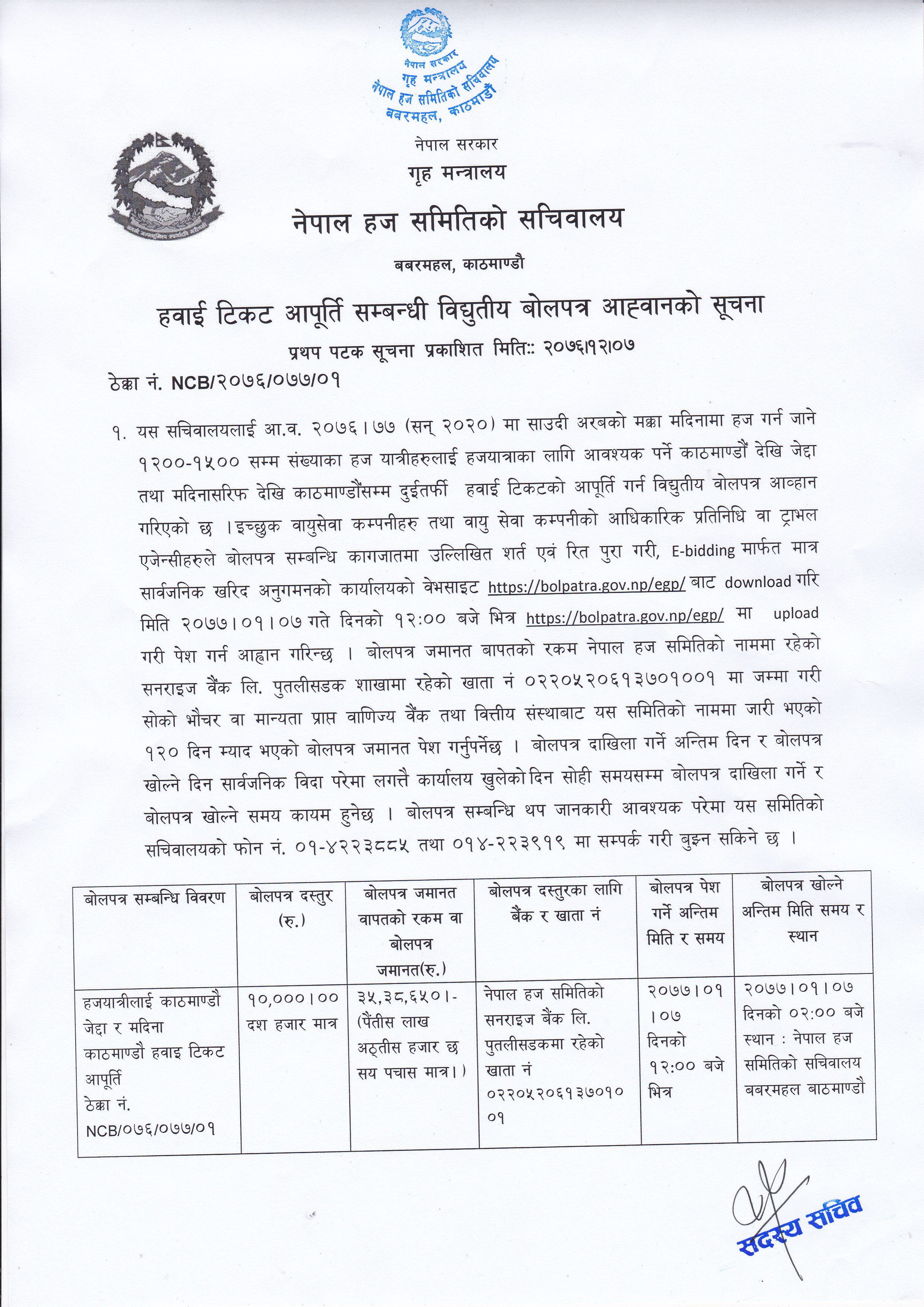 Supply of Airline Tickets for Hajj Pilgrims- 2026 खरिद सम्बन्धी बोलपत्र आव्हानको सूचना