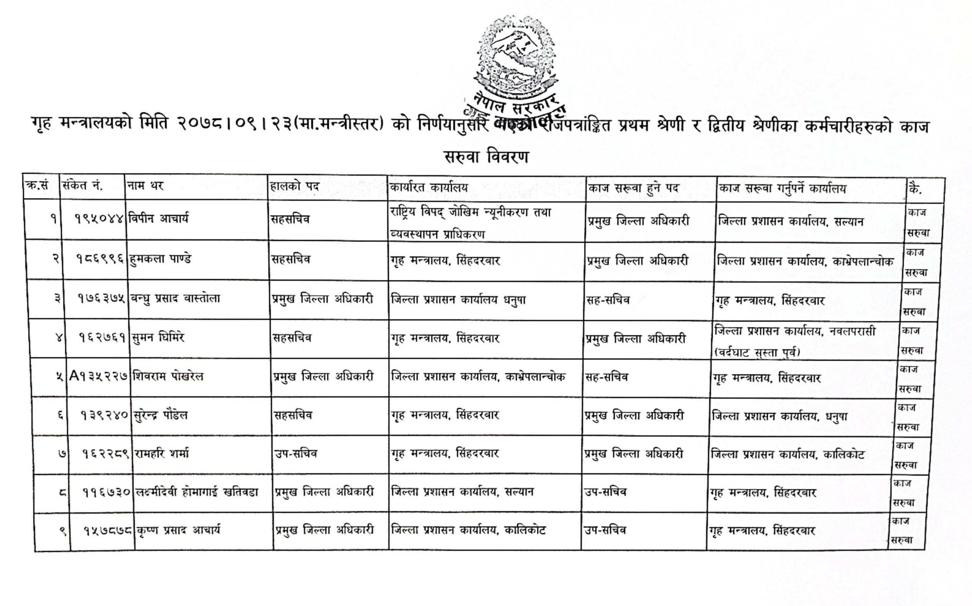 गृह मन्त्रालयको मिति २०८२।१२।२२ को निर्णयानुसार सुरुवा/पदस्थापन भएका रा.प. प्रथम र रा.प.द्वितीय श्रेणीका कर्मचारीहरूको विवरण