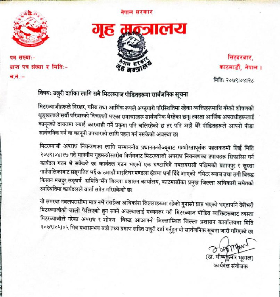 उजुरी दर्ताका लागि सबै मिटरब्याज पीडितहरुमा सार्वजनिक सूचना